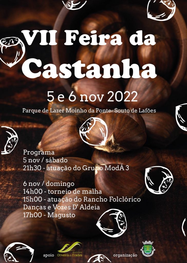 Nos próximos dias 5 e 6 de novembro irá decorrer a VII Edição da Feira da Castanha no Parque de Lazer Moinho da Ponte, em Souto de Lafões, promovida pela União das Freguesias de Oliveira de Frades, Souto de Lafões e Sejães em parceria com o Município.